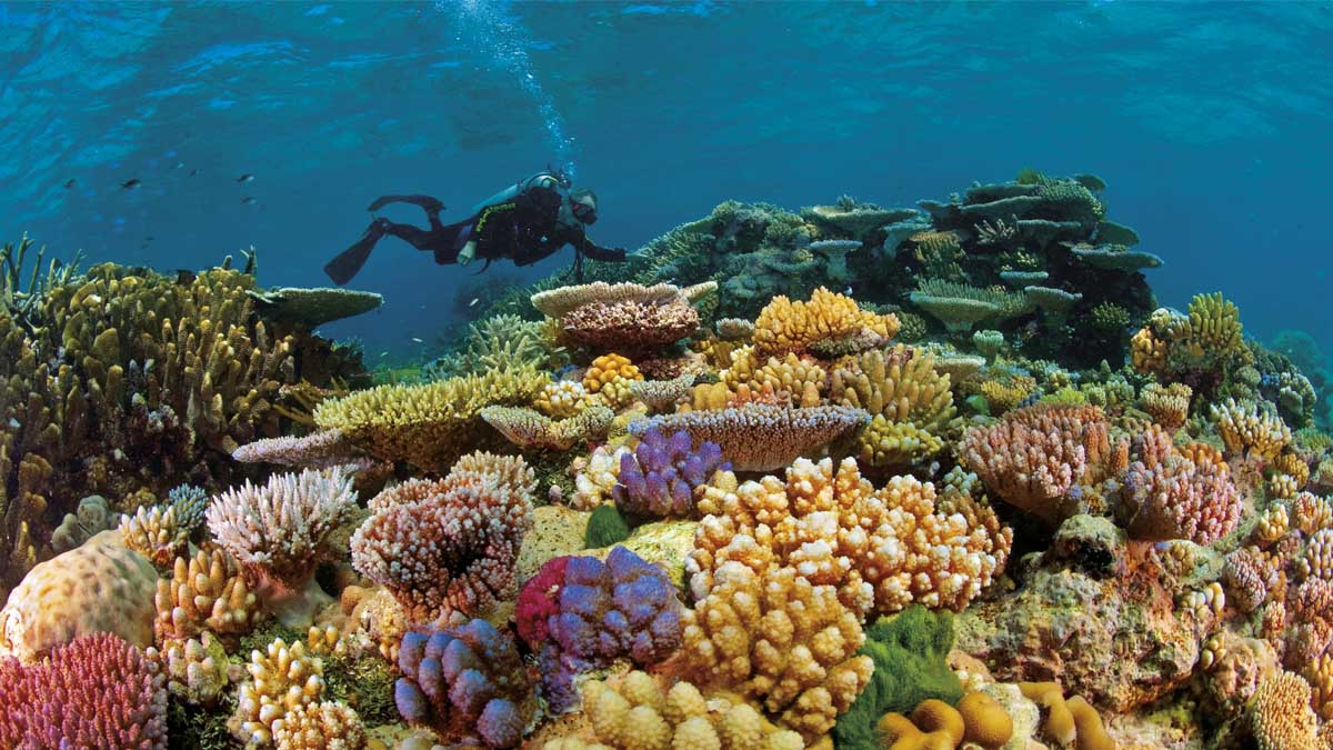 Imagem subaquática da grande barreira de corais.